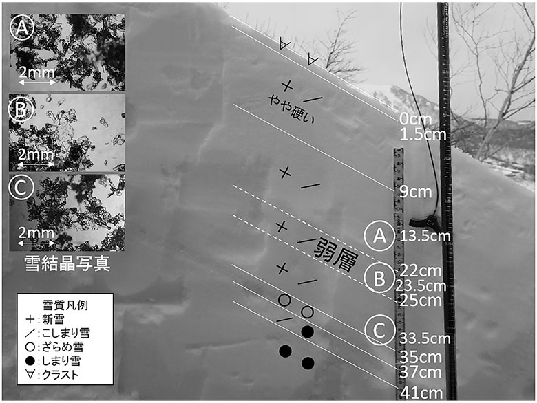 図2は、2017年3月28日午後に写真2 の地点で観測した積雪断面です。積雪表面から22cm ~ 25cm 下に表層雪崩の原因と考えられる弱い雪の(B)の層(新雪・こしまり雪層中に存在する雲粒の付着の少ない板状等の降雪結晶の弱層)が検出されました。この層は雪結晶の周りに隙間が多く、密度が小さく、とてもやわらかい層であることが確認されました。