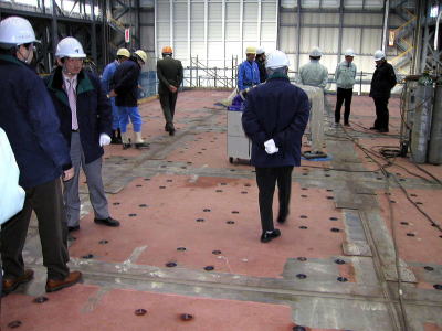 E-defense technical committee members climb on the welded shaking table to visit the fabrication process