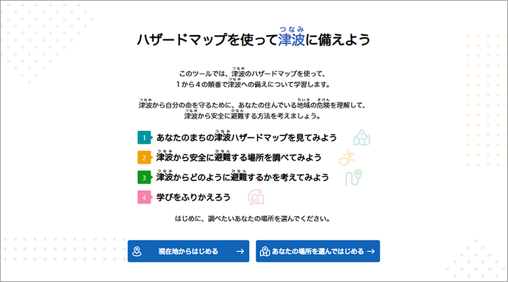津波(つなみ)から⾃分の命を守るために、津波(つなみ)ハザードマップを使って、あなたの住んでいる地域(ちいき)の危険(きけん)を学び、安全に避難(ひなん)する⽅法を考えましょう。