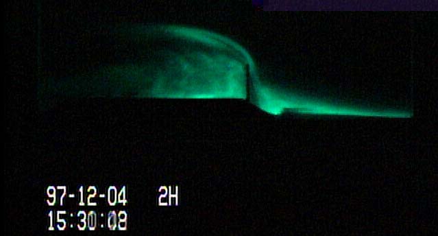 Visualized drifting snow around the model snow fence with a laser light sheet.