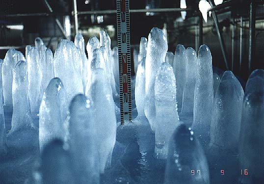 Experiment on growth of ice stalagmites in the large cold room.