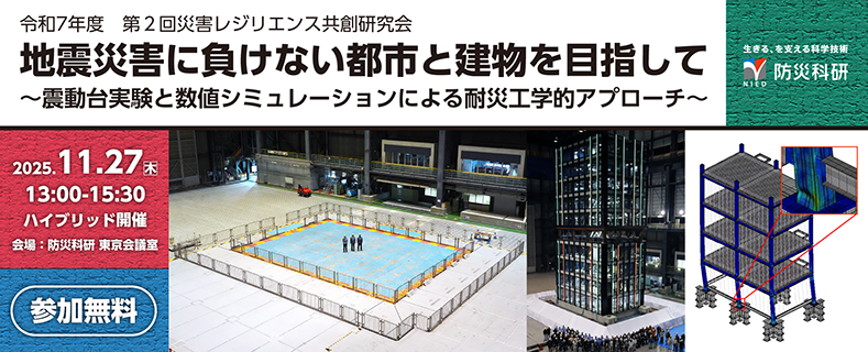 本研究会では、防災科研が産学官連携で取り組む「未然の被害への対策技術」として、建物のダメージ評価技術や数値シミュレーション技術の最新動向を紹介します。あわせて、社会経済活動を担う皆様との共同研究や技術実装の可能性について意見交換を行い、連携による新たな防災科学技術の発展に向けて、実践的な議論を深めます。 - 日時