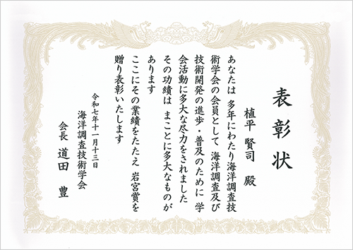 受賞一覧 2025年11月20日 海洋調査技術学会岩宮賞を受賞しました 地震津波火山観測研究センター 日本海溝海底地震津波観測管理室の植平賢司室長が、海洋調査技術学会岩宮賞を受賞しましたのでお知らせいたします。 この賞は、植平賢司室長が多年にわたり海洋調査技術学会の会員として、海洋調査および技術開発の進歩・普及のために学会活動に多大な尽力をされたとして表彰されたものです。 表彰は、11月13日に開催された海洋調査技術学会総会にて行われました。 表彰状