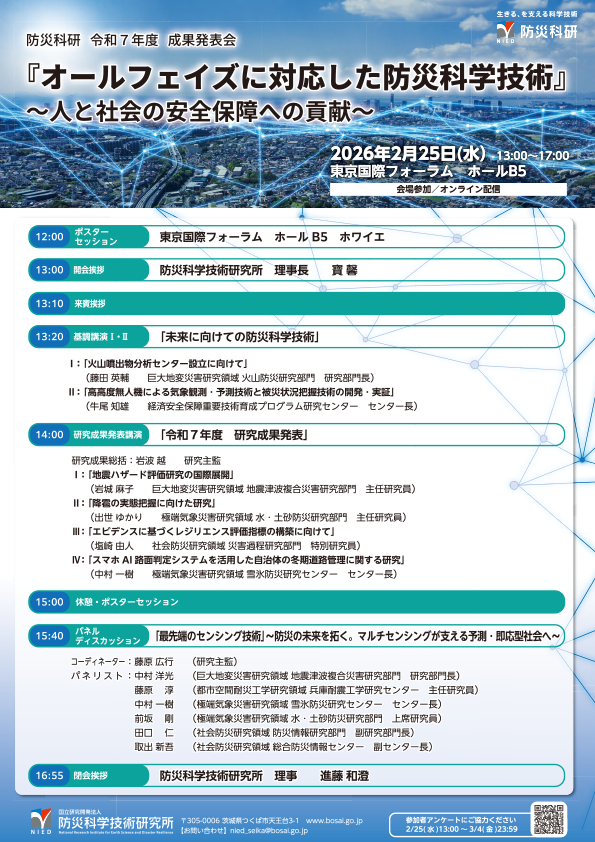 成果発表会は、2002年度以来、防災科研が毎年開催している研究成果の発表会です。講演・ポスター発表・パネルディスカッション等で、防災科研の1年間の研究成果を発表します。防災科研において一般公開と並ぶ大きなイベントです。