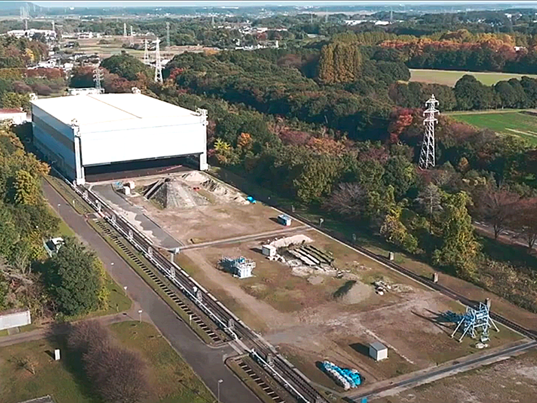 大型降雨実験施設は、豪雨によって発生する土砂崩れや侵食などの土砂災害、洪水災害を対象に、実大規模の実験を行う世界最大規模の施設です。
